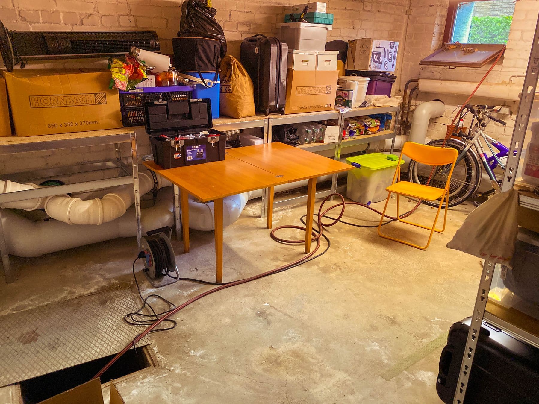 Und dann hab ich mich dem Keller gewidmet. Vor Ewigkeiten schon erzählt hatten wir da einen nicht ganz so kleinen Wasserschaden, weil das Gebäude nicht richtig abgedichtet war. Daher war das langfristige Ziel, dass nichts mehr auf dem Boden stehen sollte, dass Dauerwasser nicht gut abkann, was letztendlich bedeutet: Nahezu alles. Entsprechend haben wir recht viele Stapel gebaut und der Keller war nicht mehr wirklich betretbar, weil man ständig irgendwas hin und herräumen musste.