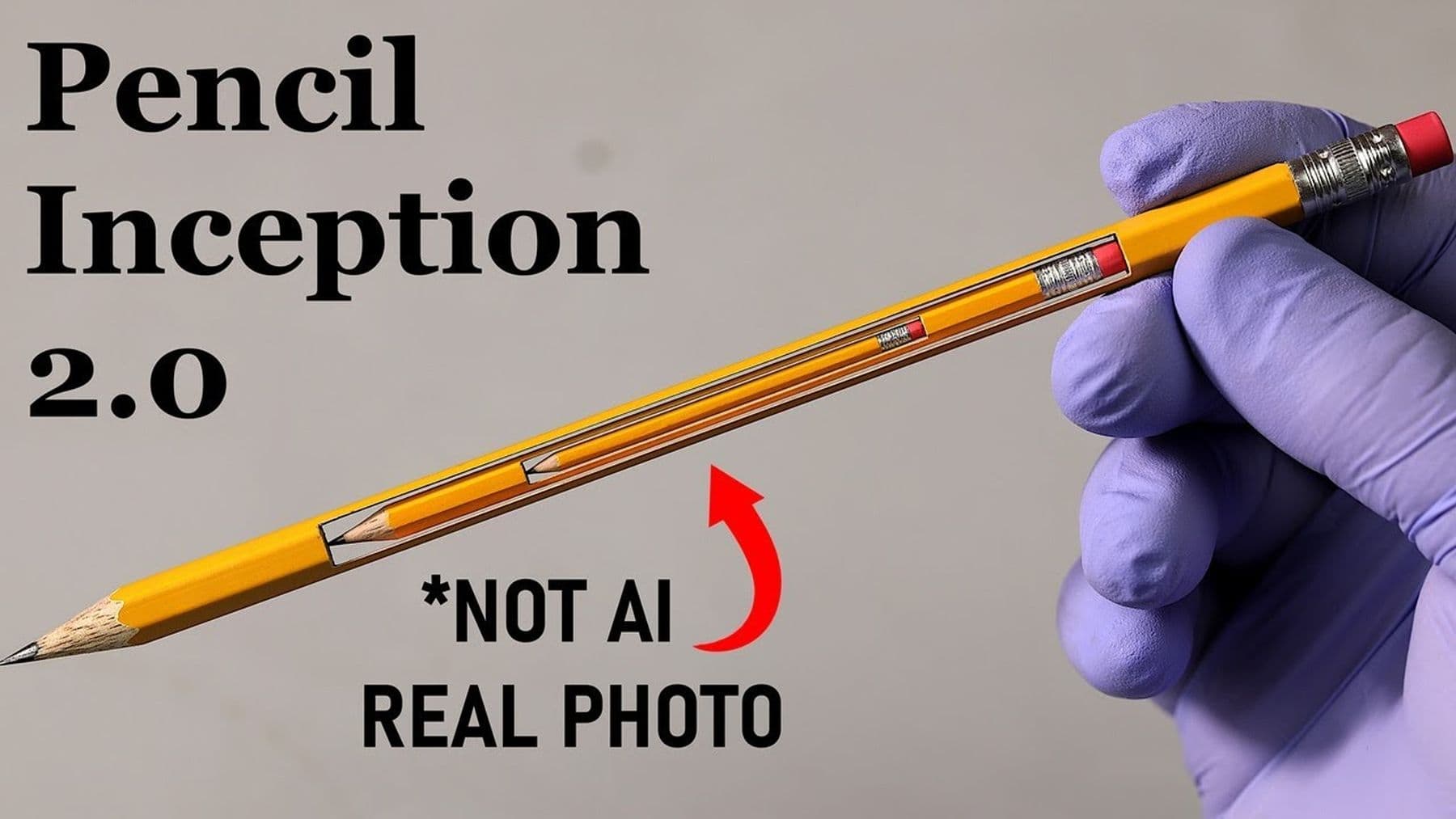 Zurück zum Thema: Bobby Duke Arts dachte sich, dass so ein Bleistift in seiner „natürlichen“ Form ein bisschen langweilig ist – viel cooler wäre doch ein Stift im Stift, der noch mal einen Stift in sich trägt. Vermute ich zumindest. Und hat daher einfach mal zu Skalpell und ein bisschen Farbe gegriffen, denn auch noch Miniatur-Radiergummis da reinzubasteln … das schafft dann vielleicht doch nur KI:
