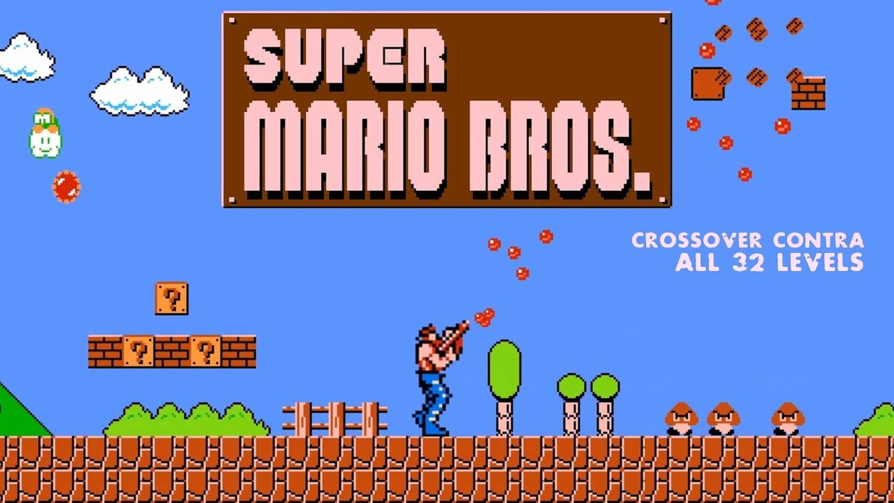 If we want to play multiplayer Mario is accompanied by Luigi, who is controlled by the other player.The video shows gameplay of Super Mario Bros. crossover Contra.