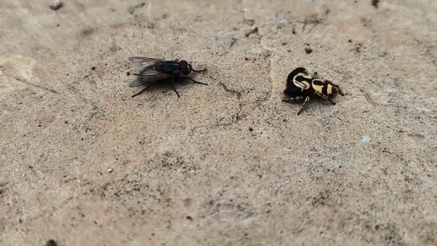 Nur eine Spinne, die eine Fliege in der Luft abfängt