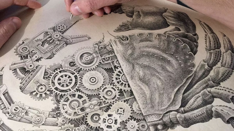 Eine biomechanische Krabbe von Steeven Salvat im Zeitraffer gezeichnet