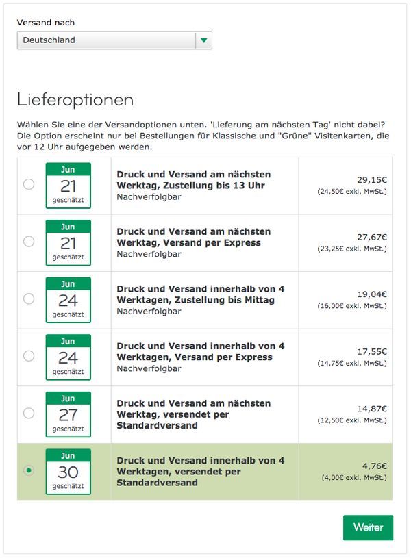 Am Ende hat man natürlich noch die Auswahl der Lieferoptionen - wer es besonders schnell braucht, muss natürlich etwas tiefer in die Tasche greifen, die Geduldigen kommen günstiger weg. Wie man sieht, hab ich die entspannte Variante genommen, bei einer Bestellung am 19.06. hatte ich die Karten dann am 24.06. hier auf dem Schreibtisch. Eine ziemlich okaye Versandzeit, wie ich finde.